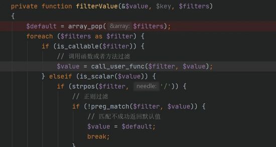 我们再回到代码执行点,我们发现call_user_func函数执行完的值会执行循环再次回到call_user_func()中当回调函数的参数进行使用。因此需要考虑一下怎么调整才能让我们执行并且抑制报错。