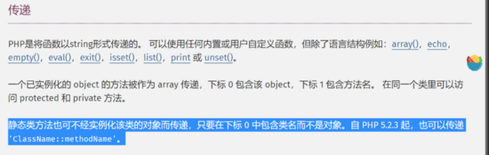 call_user_func是代码执行点,我们基本上所有PHP自带的可利用函数基本被ban掉,所以我们需要从自写的函数调用来入手,首先我们需要看下这个点。可回调函数不仅仅指的是简单函数,还可以是一些对象的方法,包括静态方法。