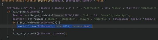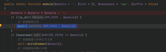 我们先看看这个该怎么走,我们看到这个mkdir是在application创建目录,但是由于权限问题肯定无法创建。根据TP报错即退出的机制从而中断执行。那么我们可以通过../public/test来创建目录。