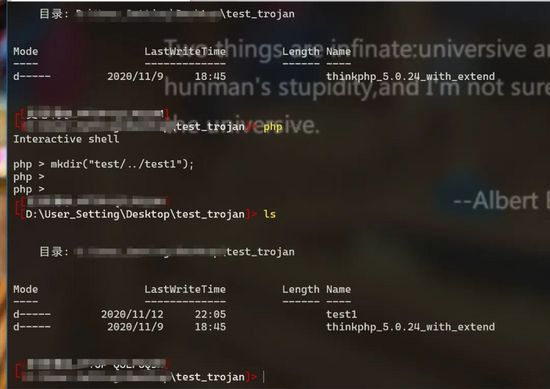 其中mkdir函数存在recursive参数为true,允许递归创建多级嵌套的目录。这样就可以使mkdir中使用不存在的目录就可以进行绕过。但是现在有个问题:前面的mkdir中的warning报错被TP捕获到直接会退出无法执行后面的内容,那么我们就需要使用一些办法进行抑制报错。我们经常做题会用到一个函数error_reporting,我们可以使用error_reporting(0)抑制报错。