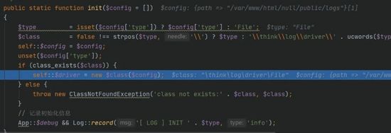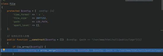 3.在其中会new了一个\think\log\driver\File,并且传入的参数是我们的'path'=>/var/www/html/null/public/logs,那么会触发类中的__construct,将其默认的path给覆盖掉。