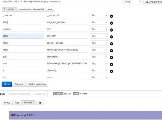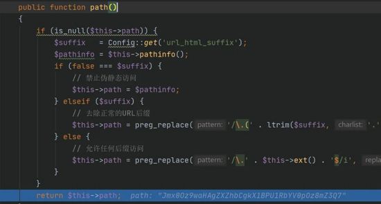 2.调用self::path方法,可以抛弃掉我们上一个执行的返回值,并且返回我们所输入的path。为什么会返回path,path为什么是我们输入的值,这个就是之前提到的代码执行点他是覆盖了Request类的参数,所以方法返回的是$this->path,这个我们可以控制。