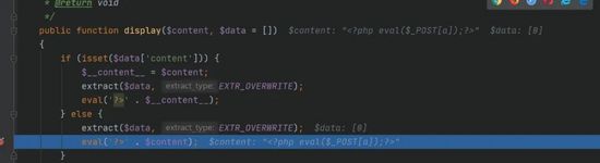 4.解码后的返回值就会进入\think\view\driver\Php::Display中,然后进入eval执行代码。