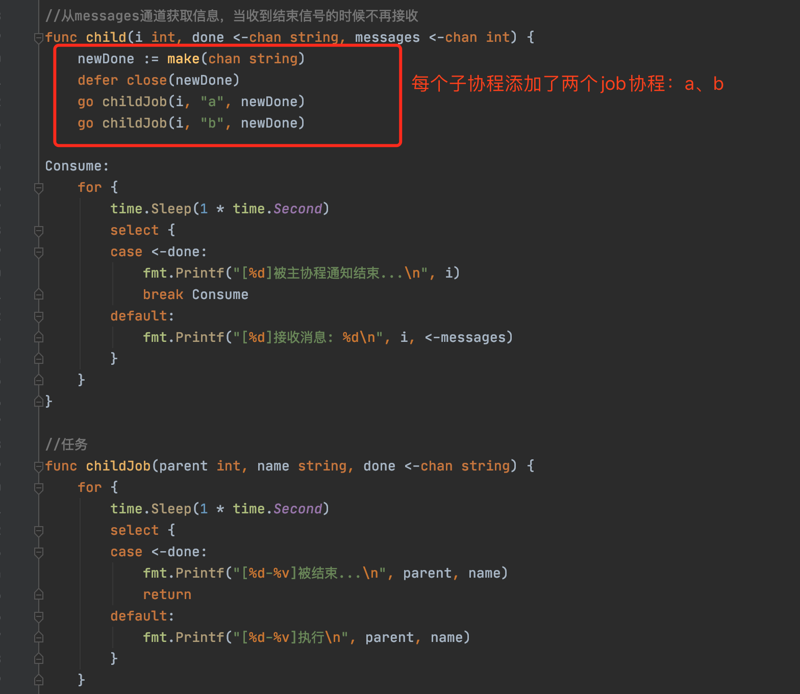 go childJob(i, "a", newDone)