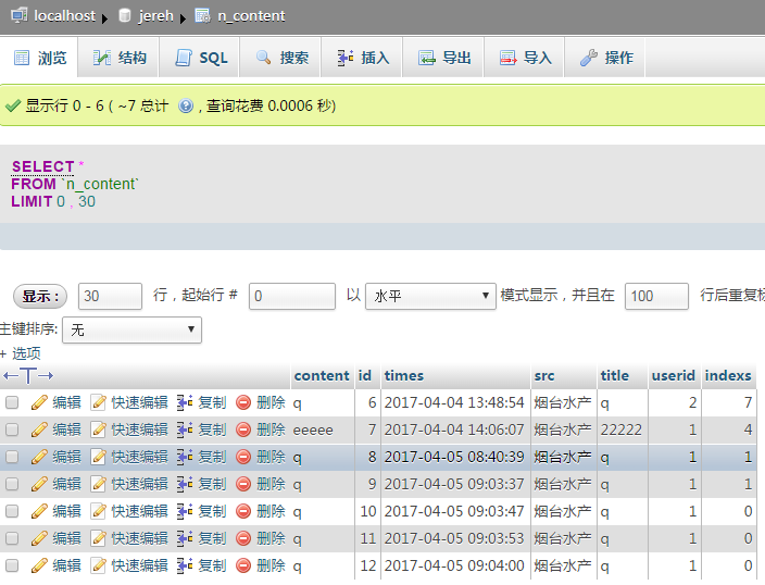 首先,我们需要准备在数据库里面准备一个表,并且插入数据,这些都是必需的前提工作了,不多说,如图所示(库名为jereh,表名为n_content):