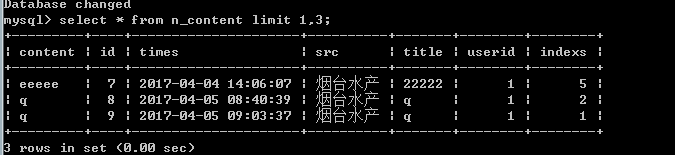 我们需要分页的话,需要用到 "select * from tableName limit num1,num2”;这是一个限定查询的语句,后面跟两个参数,num1为从第几个开始查找,num2为查找的信息的个数,如我想查找2,3,4这三条数据,如下图所示