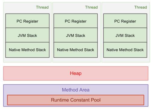 通常,在载入内存后,一个Java程序所占用的内存会被大致分为3块区域:堆(heap),栈(stack)和方法区(method area)。