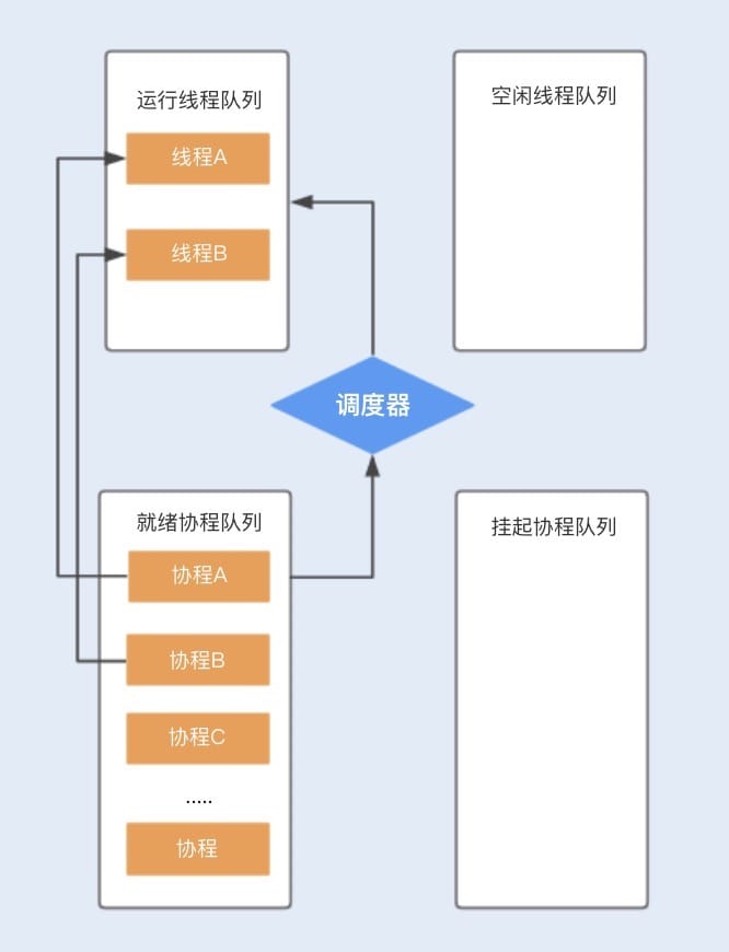 假设程序中默认创建两个线程为协程使用,在主线程中创建协程ABCD…,分别存储在就绪队列中,调度器首先会分配一个工作线程A执行协程A,另外一个工作线程B执行协程B,其它创建的协程将会放在队列中进行排队等待。
