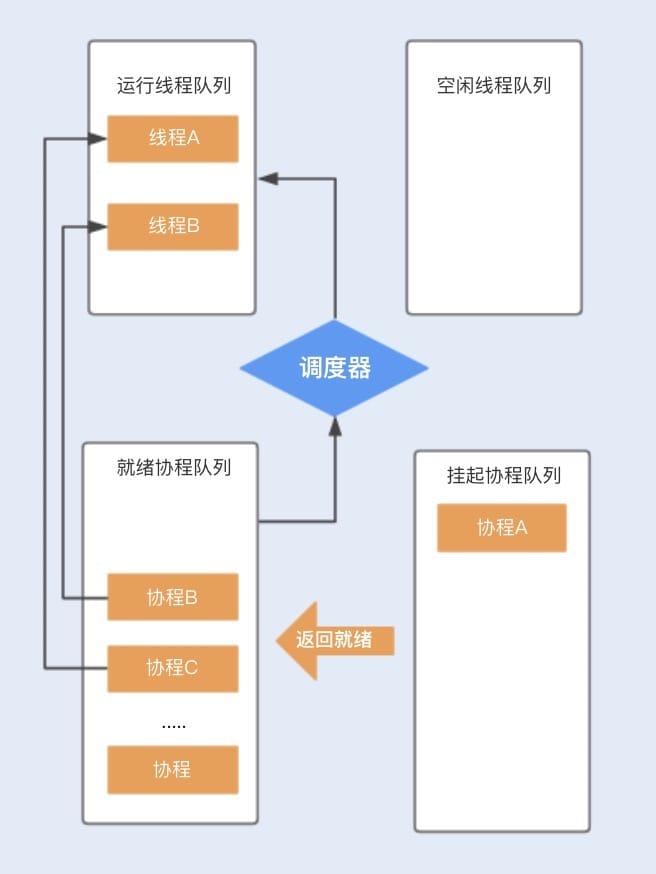 当协程A调用暂停方法或被阻塞时,协程A会进入到挂起队列,调度器会调用等待队列中的其它协程抢占线程A执行。当协程A被唤醒时,它需要重新进入到就绪队列中,通过调度器抢占线程,如果抢占成功,就继续执行协程A,失败则继续等待抢占线程。