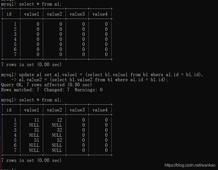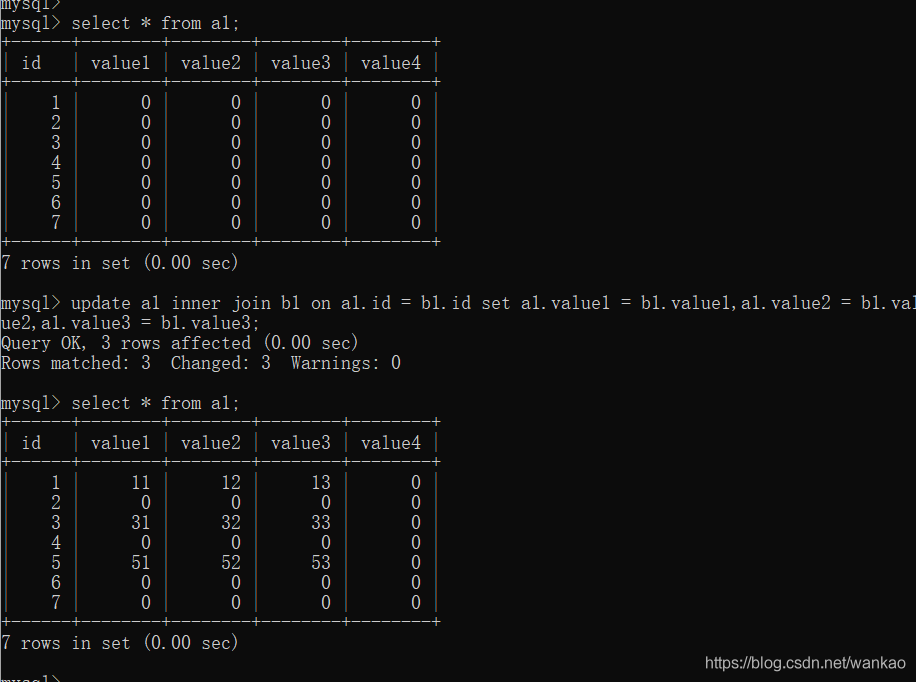 update a1 inner join b1 on a1.id = b1.id set a1.value1 = b1.value1,