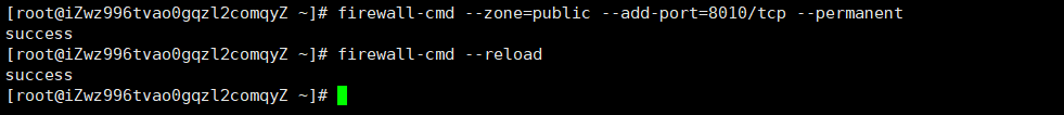 这样就成功的将8010端口加入了public区域中,permanent参数表示永久生效,即重启也不会失效,最后不要忘记更新防火墙规则: