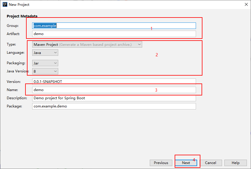 2.填写Group和Artifact(此处我使用的是默认,请根据实际情况填写),项目类型选择Maven项目,语言选择Java,打包类型选择Jar(SpringBoot内置Tomcat,web项目可以直接以Jar包的方式运行),Java 版本选择8,Name自己填写,Next