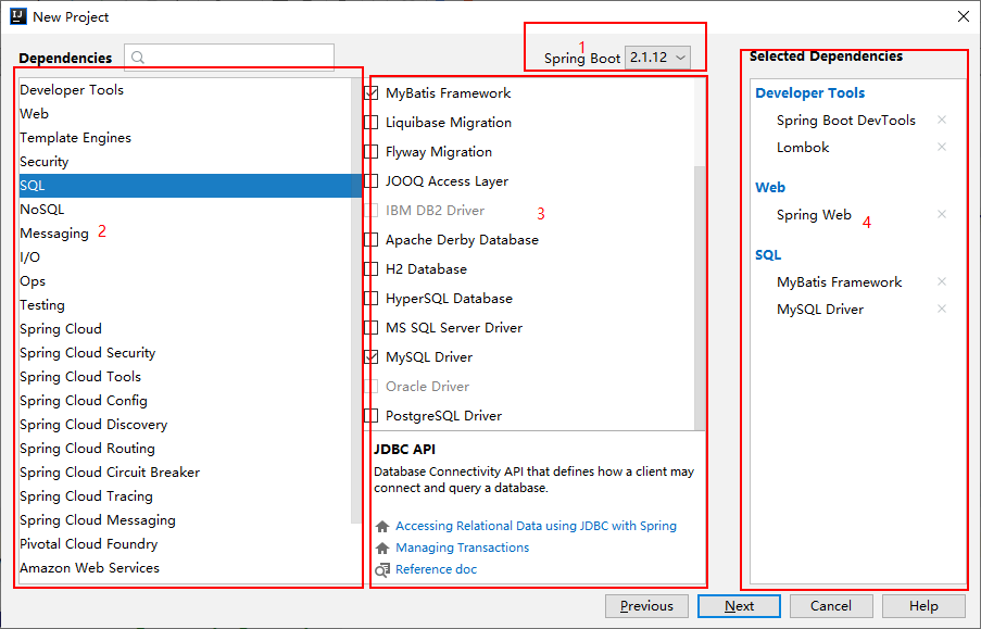 在下面的可以选择相应的starter包,我们可以在此处快速选择,也可以等到pom文件中再手动添加。我们选择最常用的最基本的几个:Spring bootDevTools:实现热部署,Lombok:使用Lombok的注释,Spring Web,Mybatis和MySQL驱动,选择完毕后,Next