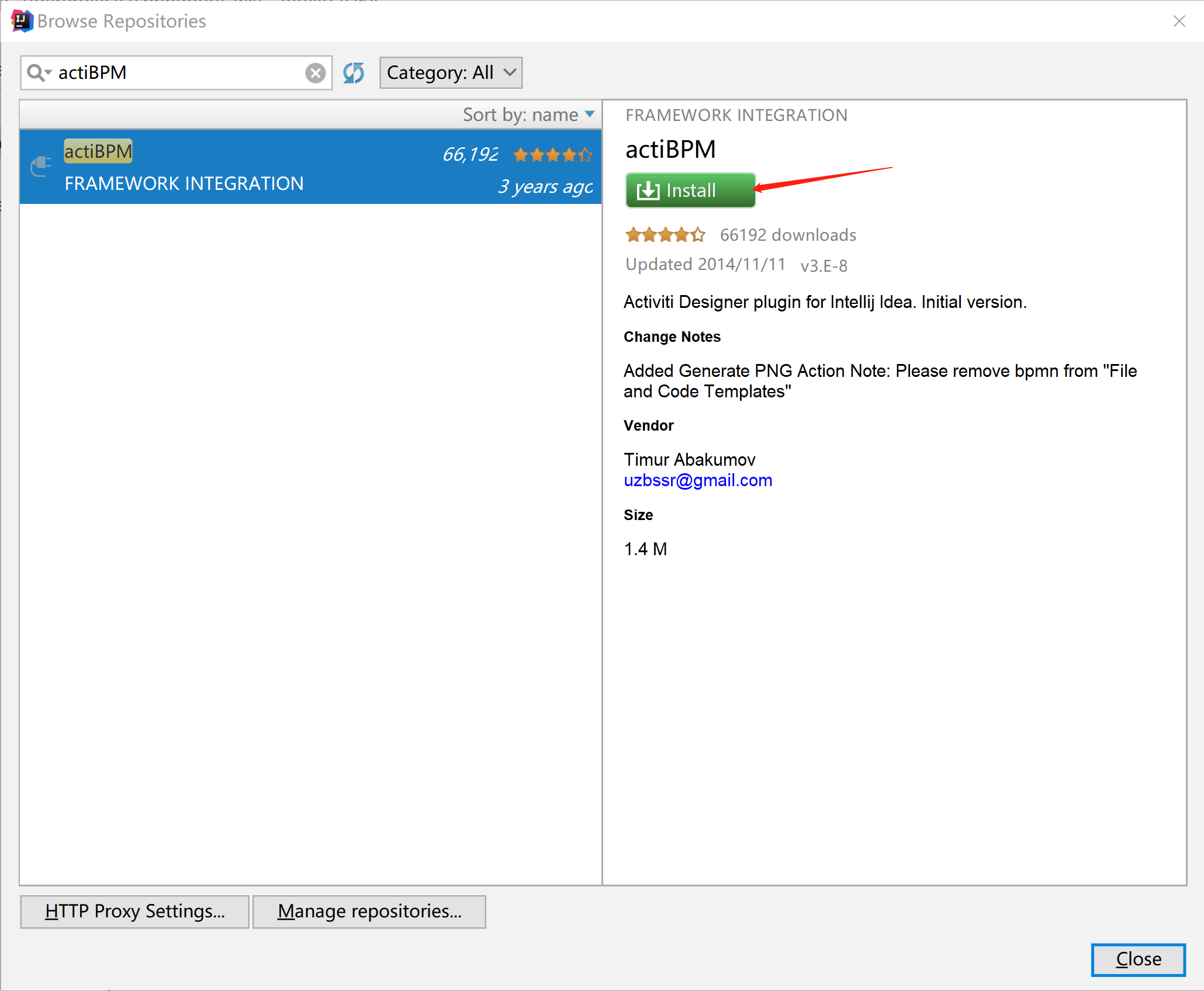 进入【Browse Repositories】窗口,选中左侧的【actiBPM】,点击右侧的【Install】按钮,开始安装。