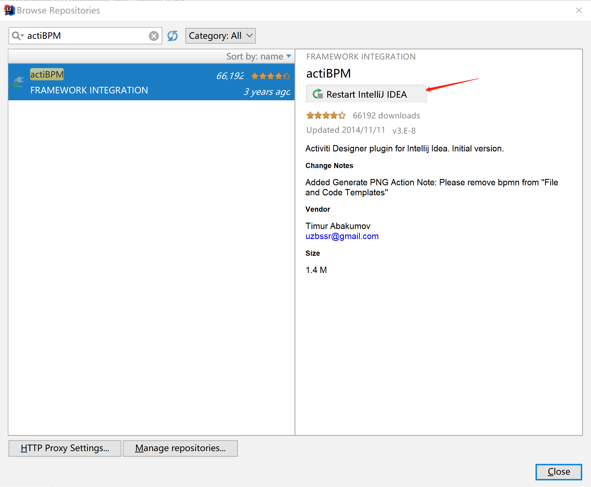 点击左侧【Plugins】按钮,在右侧输出"actiBPM",点击下面的【Search in repositories】链接会打开【Browse Repositories】窗口。
