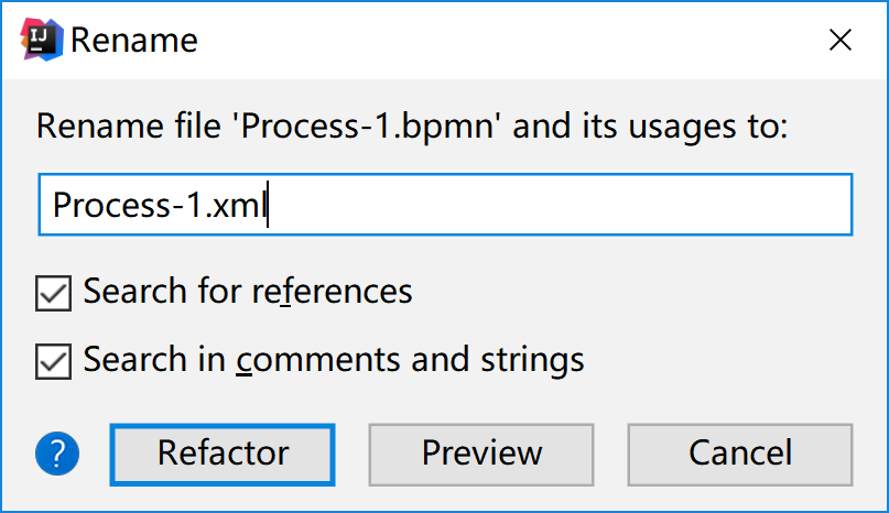 右击bpmn文件,选择【Refactor】-->【Rename】,修改其扩展名为.xml,点击【Refactor】