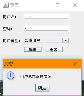 JOptionPane.showMessageDialog(null, "用户名或密码错误");
