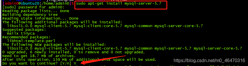 # 执行下面安装命令 # 安装mysql5.7服务端 sudo apt-get install mysql-server-5.7 # 安装mysql5.7客户端 sudo apt-get install mysql-client-5.7 # 使用c/c++等语言操作mysql的动态链接库,如果不需要可不安装 sudo apt install libmysqlclient-dev