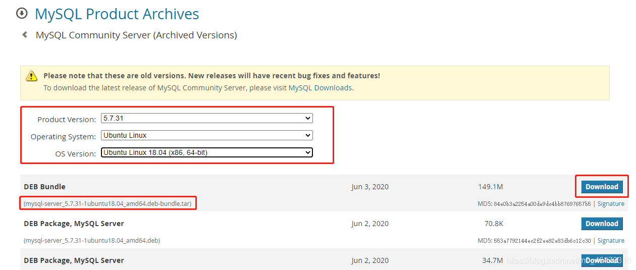 # 在服务器里直接获取(服务器需要联网) wget https://dev.mysql.com/get/Downloads/MySQL-5.7/mysql-server_5.7.31-1ubuntu18.04_amd64.deb-bundle.tar # 也可以直接将网址粘贴到浏览器下载安装压缩包 https://dev.mysql.com/get/Downloads/MySQL-5.7/mysql-server_5.7.31-1ubuntu18.04_amd64.deb-bundle.tar