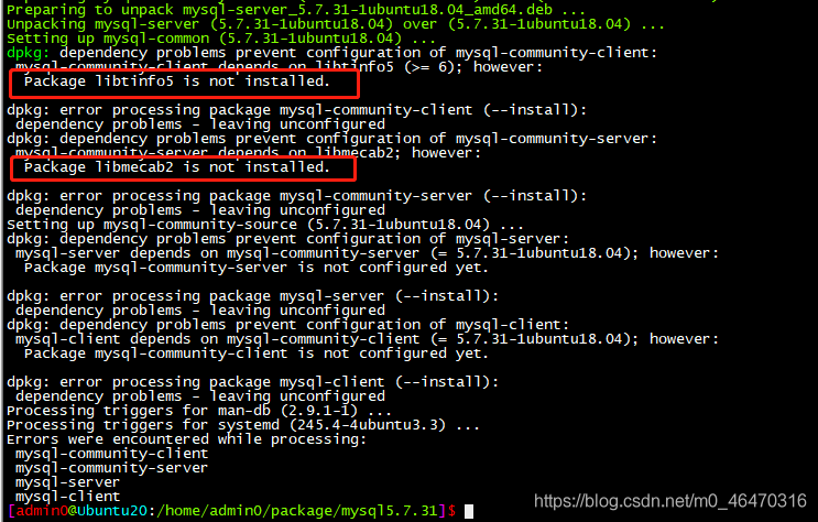 报错的意思是缺少 2个包 libtinfo5 和 libmecab2,那就安装这两个包,如果还缺少其他包,按照下面的步骤安装即可。