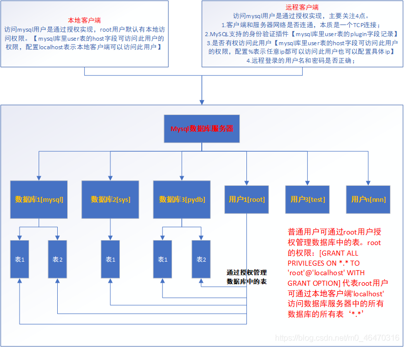 # 查看用户test0的权限 show grants for test0@localhost; 显示:[GRANT USAGE ON *.* TO 'test0'@'localhost'] USAGE: 表示无权限用户。 # 用test0用户登录pydb数据库 mysql -utest0 -ptest0111 pydb 报错提示无权操作:[ERROR 1044 (42000): Access denied for user 'test0'@'localhost' to database 'pydb'] # 使用root用户给test0用户赋权 grant all privileges on '数据库名'.'表名' to '用户名'@'IP地址' identified by "密码" with grant option; # 例如设置本地客户端访问此用户: mysql> grant all privileges on pydb.* to 'test0'@'localhost' identified by 'test0111' with grant option; # 设置远程任意客户端访问此用户: mysql> grant all privileges on pydb.* to 'test0'@'%' with grant option; # 刷新权限 mysql> flush privileges; # 查看本地权限 show grants for 'test0'@'localhost'; 回显:[GRANT ALL PRIVILEGES ON `pydb`.* TO 'test0'@'localhost' WITH GRANT OPTION] # 查看远程权限 show grants for 'test0'@'%'; 回显:[GRANT ALL PRIVILEGES ON `pydb`.* TO 'test0'@'%' WITH GRANT OPTION] 权限都添加成功了,现在本地客户端和远程客户端都拥有了登陆test0用户操作pydb数据库下的所有表的权限了。 # 赋权命令解释 grant: 赋权关键字 all privileges: 赋权类型,all privileges表示所有权限。也可以赋值具体的权限如:select、update、create、drop等。 on: 表示权限要赋给哪个数据库的哪个表,*.* 表示所有数据库的所有表。 to: 表示权限要赋给哪个用户,格式:”用户名”@”登录IP或域名”。localhost表示本机客户端可登录此用户, %表示任何主机客户端都可以登录此用户,如果配的是具体ip例如'用户名'@'192.168.113',表示只允许192.168.113这个主机客户端登录此用户。 也可以配置IP段例如'用户名'@'192.168.%' identified by: 设置此用户的登录密码,也可以不设置。 with grant option: 表示允许此用户将自己的权限授权给其它用户。 注意: grant添加的权限是自动叠加的,比如第一次添加了select权限后面再添加insert权限,那么此用户就拥有select和insert权限。如果此用户已经拥有所有权限,再添加select权限则此用户还是拥有all privileges所有权限。 # 移除权限 revoke insert on '数据库名'.'表名' from '用户名'@'IP地址'; # 例如移除insert权限: revoke insert on pydb.* from 'test0'@'localhost'; # 例如所有权限: revoke all on pydb.* from 'test0'@'localhost'; # 刷新权限 mysql> flush privileges;
