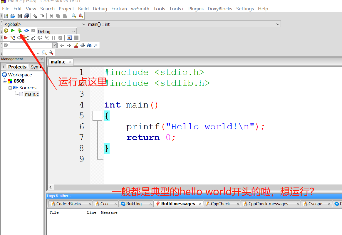 那么这两个绿绿的区别是什么呢,就是,如果你修改过代码,想运行修改后的版本,点右边那个,否则点前面那个是上一次运行的状态哦(就是你上一次运行是代码是怎么样的就运行那个代码) 8.Hello World出来啦!可喜可贺可喜可贺