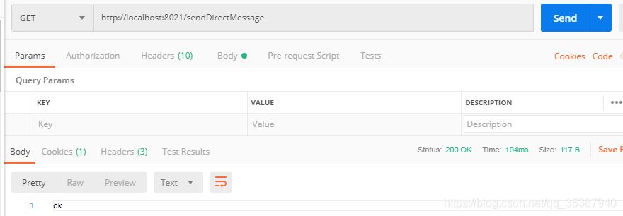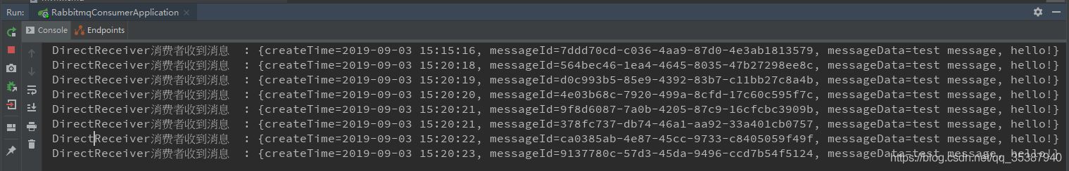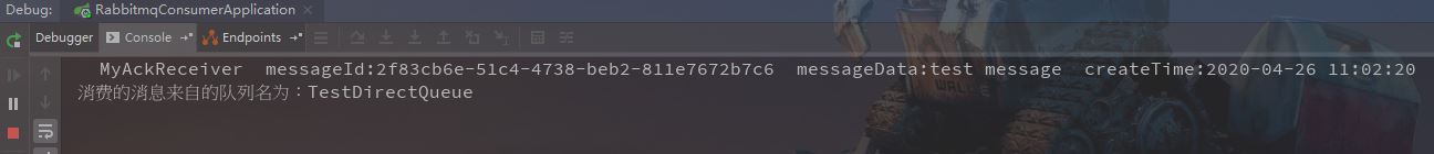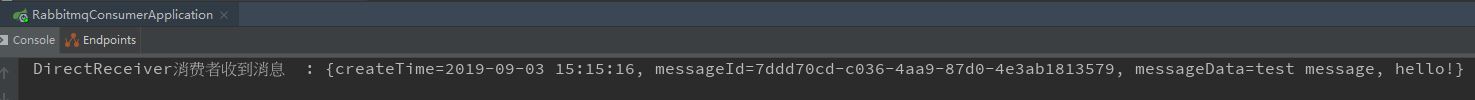这时,先调用接口/sendDirectMessage, 给直连交换机TestDirectExchange 的队列TestDirectQueue 推送一条消息,可以看到监听器正常消费了下来: