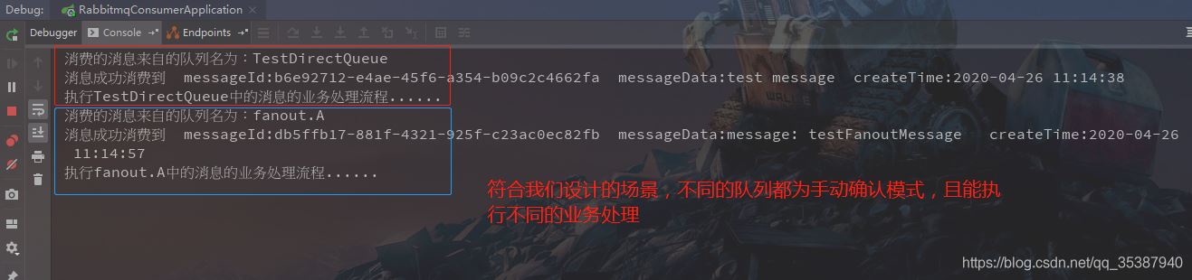 但是我们需要做不用的业务逻辑处理,那么只需要 根据消息来自的队列名进行区分处理即可,如: