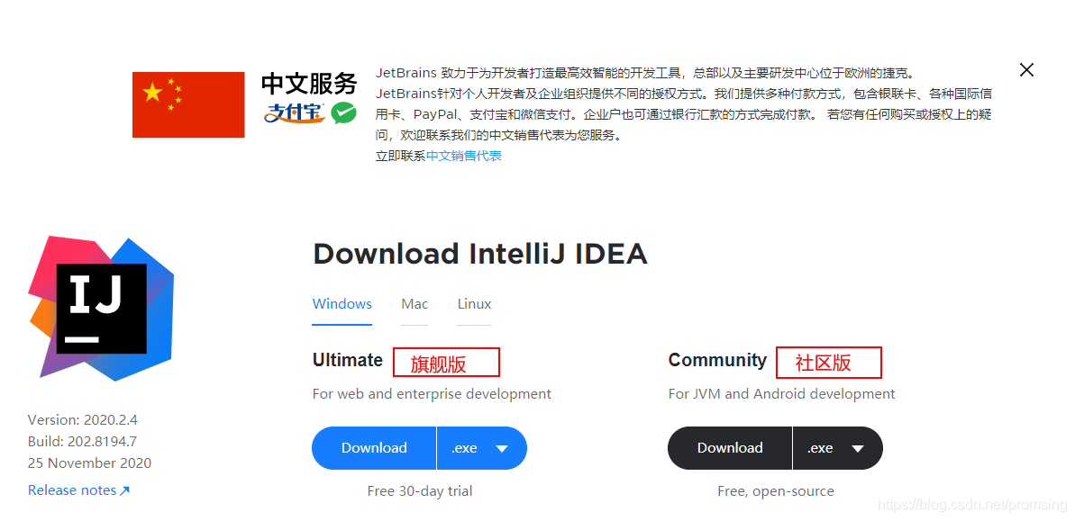 Ultimate是旗舰版,有免费30天的使用特权。右边是社区版免费使用。博主下载的是旗舰版,因为作为开发人员应选择最强大的IDE,去开发产品,里面各种功能无限制。