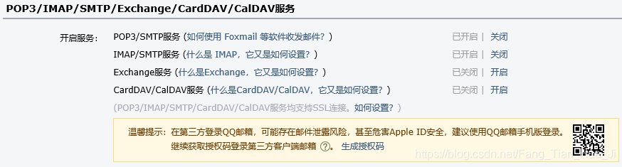 第一个坑需要注意了,上图是qq邮箱中的邮箱设置,需要在账户中开启POP3/SMTP服务(一定要开启,不然即使Python中的代码都是对的,也不能正常发送邮件,因为Python中发邮件用的是SMTP的邮件传输协议包),这里还有一个坑需要注意的是:如果你把这个邮箱当作是发送邮件的一方,还需要记住授权码,因为Python中邮箱的登录是用授权码的而不是密码。