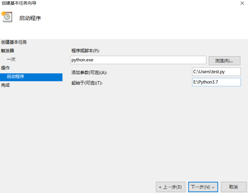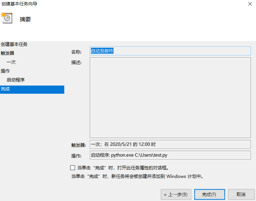 程序或脚本一栏不需要改变,起始于(可选)指的是Python的路径,添加参数(可选)指的是刚才编好的自动发邮件程序的路径。