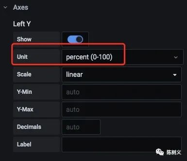 在「图表设置区」的「Axes」中设置「Left Y」的「Unit」设置其单位为:percent (0.0-1.0)。