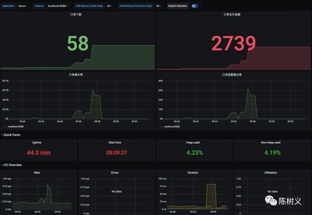 我们通过一个简单的订单业务,模拟了实际的订单数、订单金额变化情况。接着,我们通过配置订单总数、订单总金额、订单数增长率、订单金额增长率这几个图表来实现自定义指标的监控。