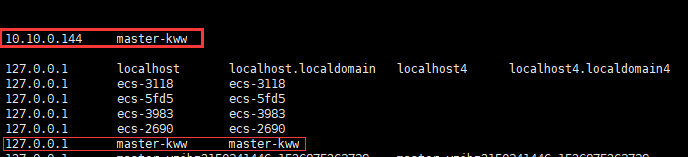 因为默认云服务器默认主机名都是一大串数字并不好操作,建议修改一下服务器主机名: vim /etc/hostname 我这里改成 master-kww(下面会用到该主机名) 同时在 /etc/hosts 文件中加上自己的主机名,上面第一个红色框是我云服务器的ip地址。