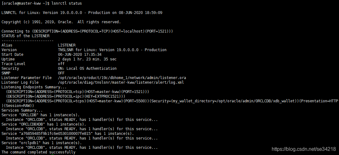 等大概10分钟左右,数据库创建成功,可以通过 lsnrctl status 查看