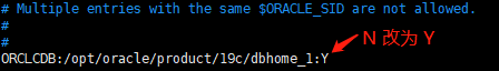 1、 oracle用户操作,修改文件: vim /etc/oratab 最后一行,把: ORCLCDB:/opt/oracle/product/19c/dbhome_1: N 改为:ORCLCDB:/opt/oracle/product/19c/dbhome_1: Y