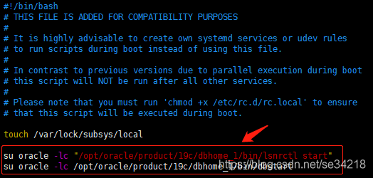 2、 root用户操作,修改centos系统启动脚本: vim /etc/rc.d/rc.local 在最后加入以下两行: 启动监听:su oracle -lc "/opt/oracle/product/19c/dbhome_1/bin/lsnrctl start" 这句要加引号是因为“lsnrctl start”之间有空格 启动数据库:su oracle -lc /opt/oracle/product/19c/dbhome_1/bin/dbstart