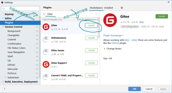 打开Setting中的Plugins选项,然后进行gitee插件搜索和安装,如图所示: