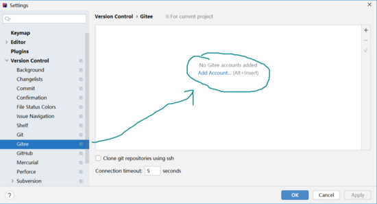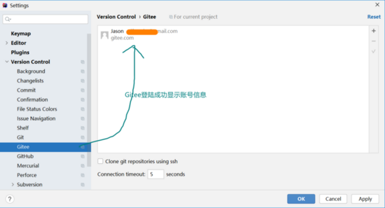 点击Version Control的Gitee选项,进入Gitee配置,如图所示: