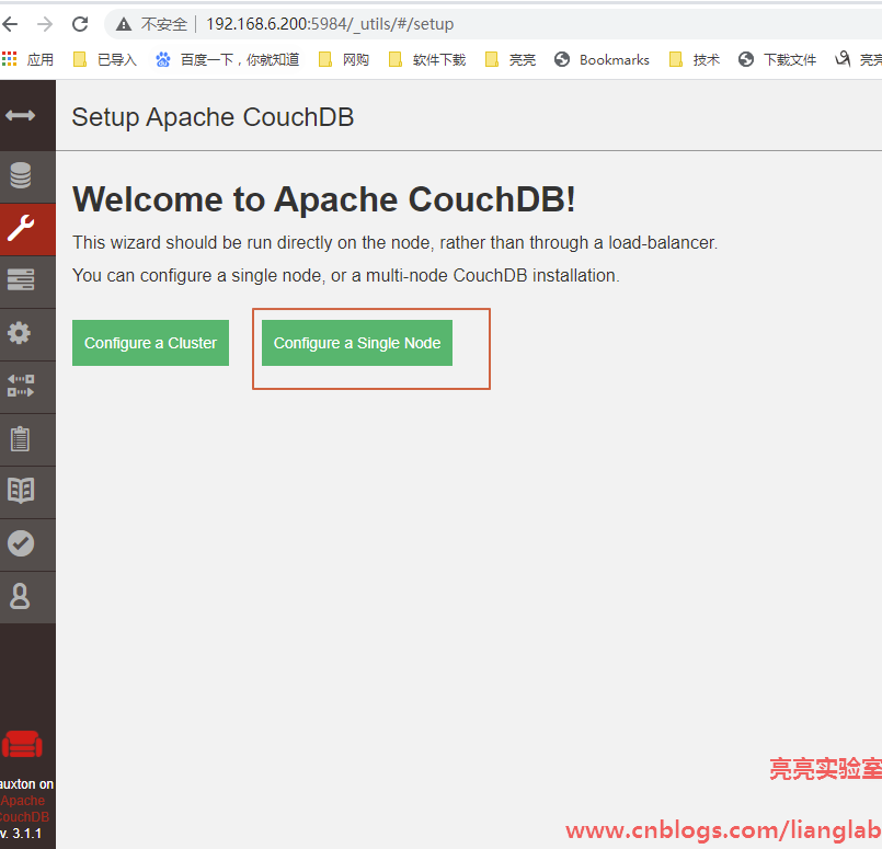 【3】登录后,安装程序将要求您将CouchDB配置为单节点实例或设置集群。单击“配置为单节点”。
