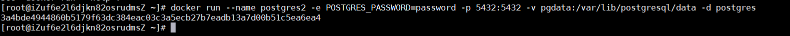 docker run --name postgres2 -e POSTGRES_PASSWORD=password -p 5432:5432 -v pgdata:/var/lib/postgresql/data -d postgres