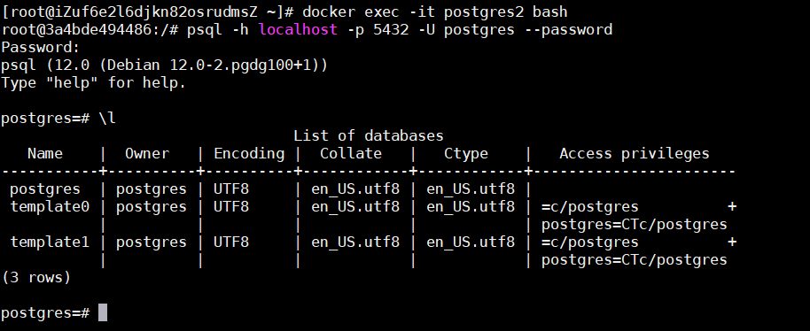 # 进入容器 docker exec -it postgres /bin/bash # 进入文件夹 cd /usr/lib/postgresql/9.6/bin # 进入postgresql,默认的postgres用户 psql -Upostgres