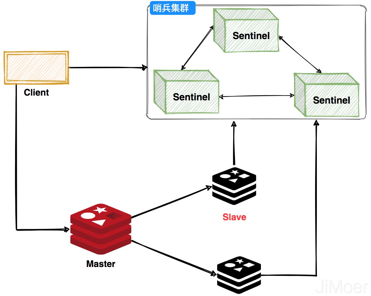 哨兵可以监控Redis集群的健康状态,当主节点挂掉之后,选举出新的主节点。客户端在使用Redis的时候会先通过Sentinel来获取主节点地址,然后再通过主节点来进行数据交互。当主节点挂掉之后,客户端会再次向Sentinel获取主节点,这样客户端就可以无感知的继续使用了。