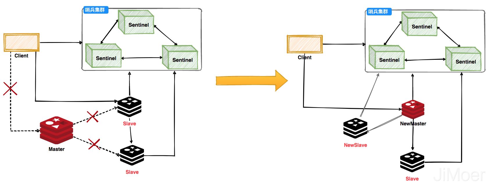 哨兵集群工作过程,主节点挂掉之后会选举出新的主节点,然后监控挂掉的节点,当挂掉的节点恢复后,原先的主节点就会变成从节点,从新的主节点那里建立主从关系。