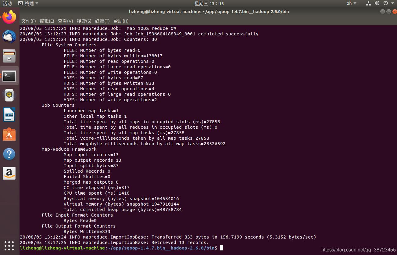 显示使用sqoop 将 postgreql上的表格数据成功导入到hdfs中,这算今天也有点收获了!