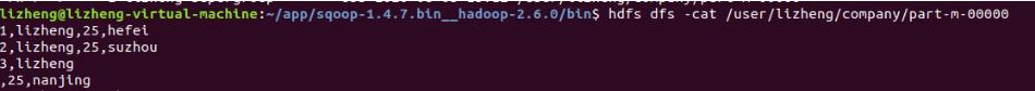 $HADOOP_HOME/bin hdfs dfs -cat /sqoop/part-m-00000(数据目录改成自己的)