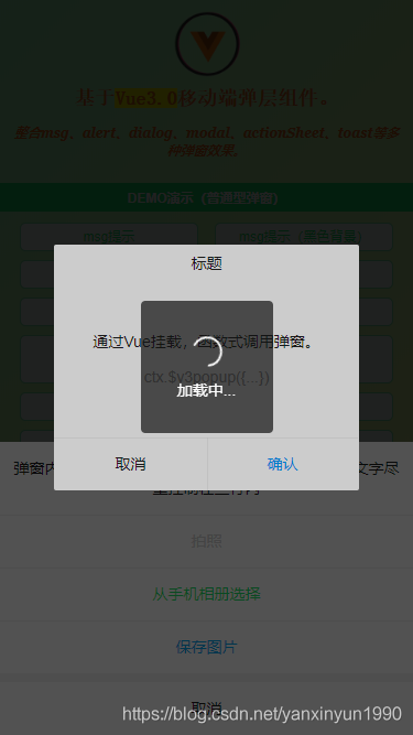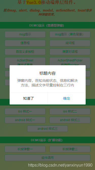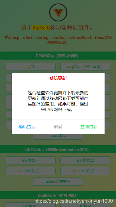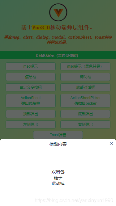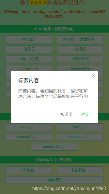 一款集合了msg、alert、dialog、modal、actionSheet、toast等多种效果的Vue3自定义弹层组件。支持上下左右弹出、圆角、自定义弹层样式、多按钮及长按/右键功能。