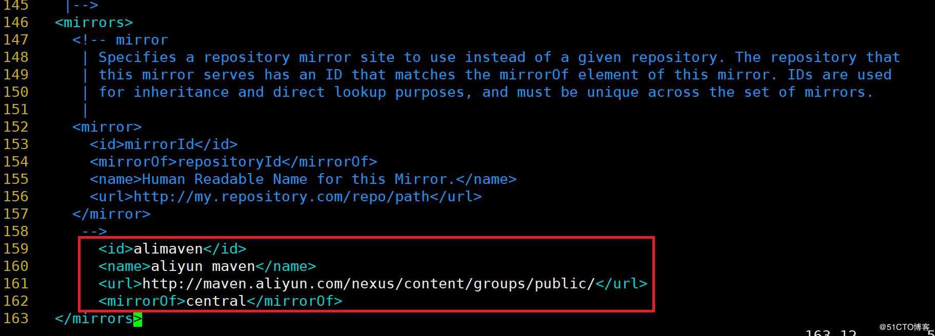 <mirror> <id>alimaven</id> <name>aliyun maven</name> <url>http://maven.aliyun.com/nexus/content/groups/public/</url> <mirrorOf>central</mirrorOf> </mirror>